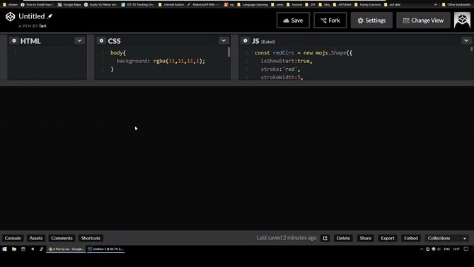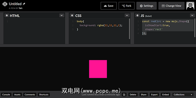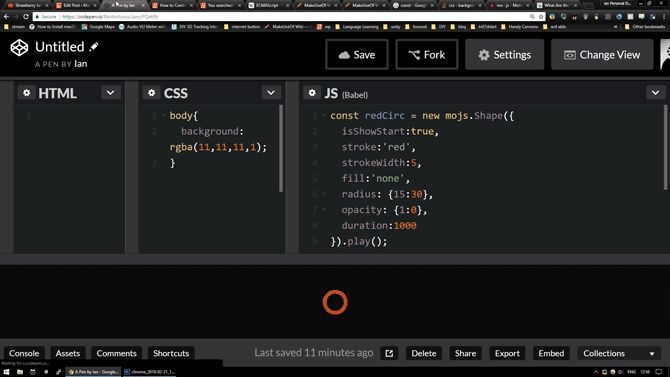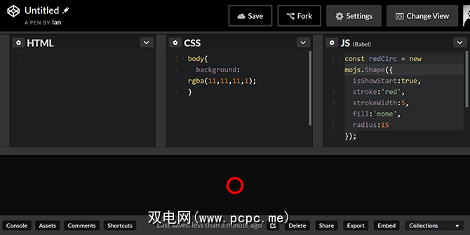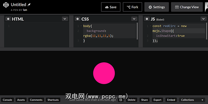 body{ background: rgba(11,11,11,1);}创建形状是一个简单的过程,其背后的概念驱动着整个库。让我们设置一个默认的圆形。在 JS 窗格中输入以下代码: