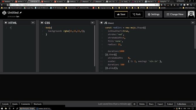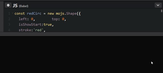 const redCirc = new mojs.Shape({ isShowStart:true});在这里,我们创建了一个名为 redCirc 的 const 值,并将其分配给 new mojs.Shape 。如果您是编码的新手,请注意此处的括号顺序,不要忘了最后的分号!