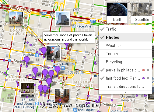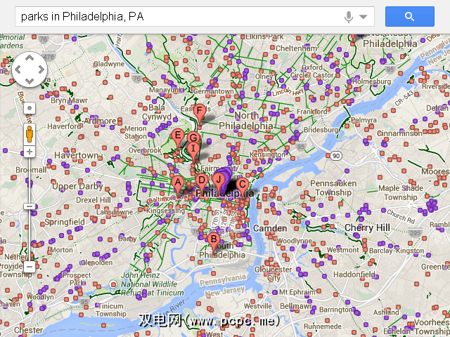 例如,我可以输入费城的公园来查找所有费城的公园。很简单,不是吗? 靠近关键字的工作方式相同。 Google地图还可以处理一些更高级的查询,例如在 Race St和Broad St 处找到交点。我倾向于从一个十字路口导航到另一个十字路口,而且我对完整的地址不太满意,所以这很有用。