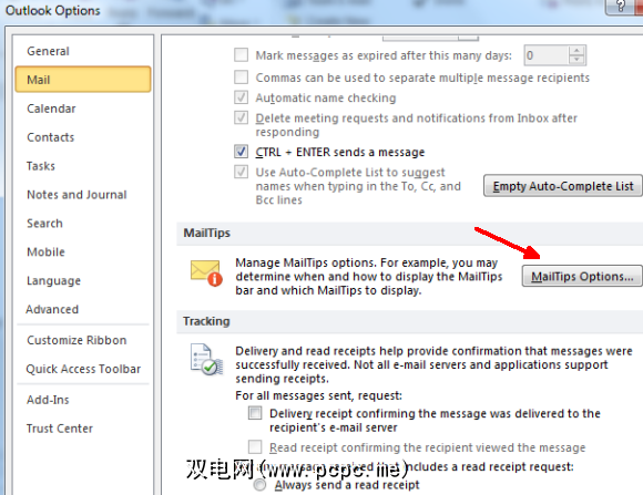 要启用MailTips,只需进入Outlook选项,选择“ Mail ",然后向下滚动直到您会看到“ 邮件提示选项"按钮。