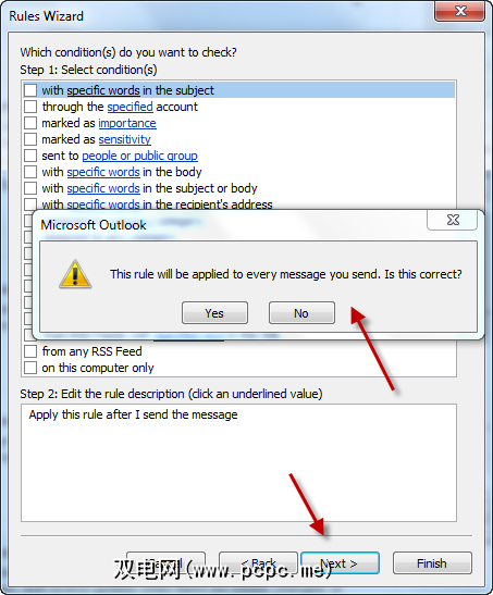 在此示例中,我将只需将其应用于所有外发邮件,然后单击下一步,然后单击警告消息的“是"。