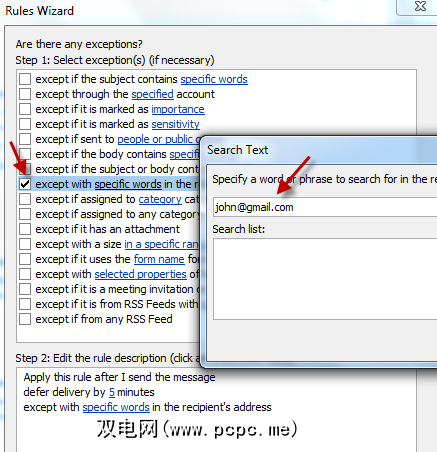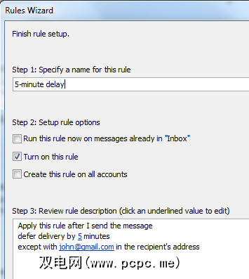 在最后一步,您可以将例外应用于此规则,以便它不会延迟发送给某些人的消息(例如)。例如,我知道我几乎可以给我的好友约翰写任何我想写的东西,而他不会生我的气。毕竟,我们是最好的伙伴–因此,对于那些邮件的电子邮件地址在“收件人"字段中的邮件,我将作一个例外。