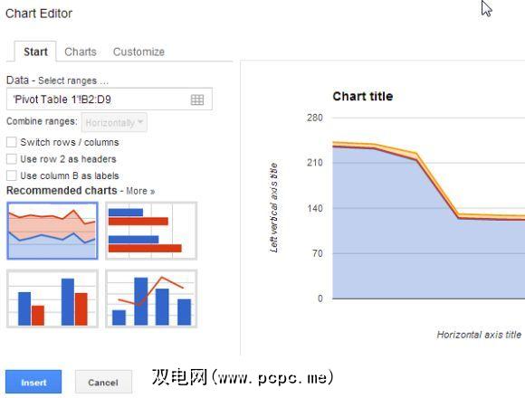 另一种分析数据的好方法是采用图形化的形式。当您使用数据透视表对数据进行了排序后,就该开始绘制图表了。 Google Spreadsheet带有大量图表工具,可以为您提供帮助。要获得这些信息,只需突出显示要绘制的数据,单击“插入"菜单项,然后从列表中选择“图表"即可。