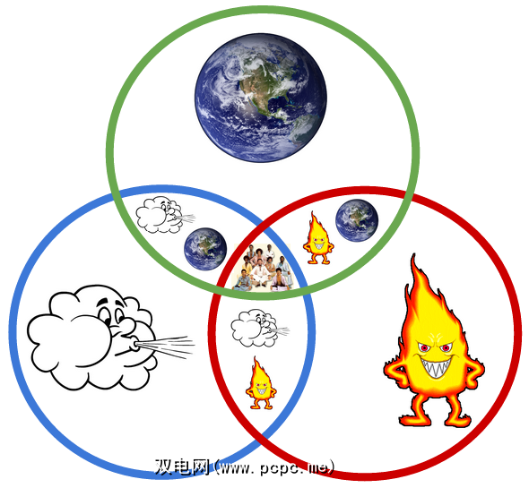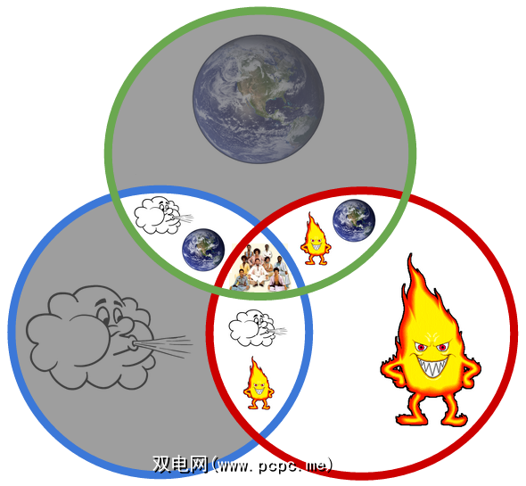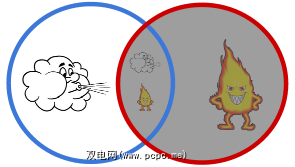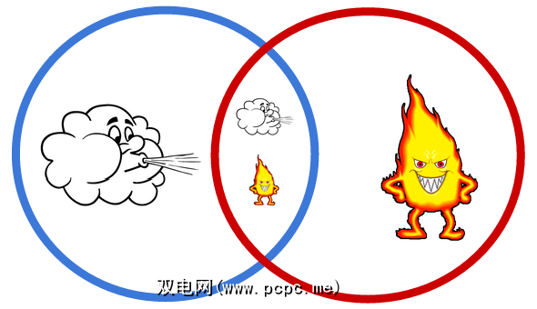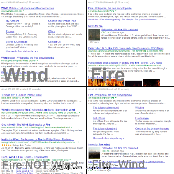 上方的维恩图显示,搜索风或火将显示 Wind , Wind AND Fire (重叠区域)和 Fire 的结果。