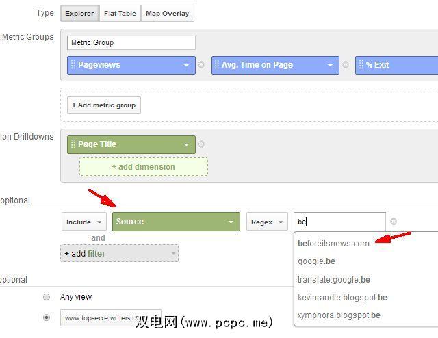 另一个有用的过滤器可以是用于查看来自特定网站的流量的历史趋势是使用“来源"维度。例如,我知道我每个月都会收到来自beforeitsnews.com的访问量。为了跟踪一段时间以来从该站点收到的流量,我将维度过滤器更改为“源",然后键入“ beforeitsnews.com"。