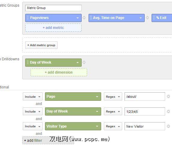 通过选择“页面"维度来过滤网址的“ / about /"部分。通过选择“星期几"维度并输入“ 1 | 2 | 3 | 4 | 5"来过滤星期一至星期五。星期一是“ 1",星期五是“ 5"。最后,您可以通过选择“访问者类型"维度并键入“新访问者"来仅“包括"新访问者。