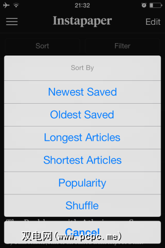 Instapaper最近添加了一些新的排序和过滤选项。要访问这些内容,请在打开应用程序时在屏幕上将其拉下,然后将显示``排序依据''菜单。