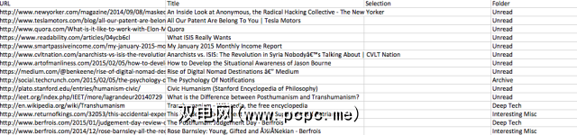 导出时并以电子表格形式打开,数据有四列。文章URL,标题,选择(源)和文件夹(如果您将文章分类到一个文件夹中)。然后,您可以根据需要过滤列表,以便仅将相关文章导入其他阅读后的应用程序,例如Pocket(替代性数字书签服务),Pinboard或您喜欢的其他任何地方。