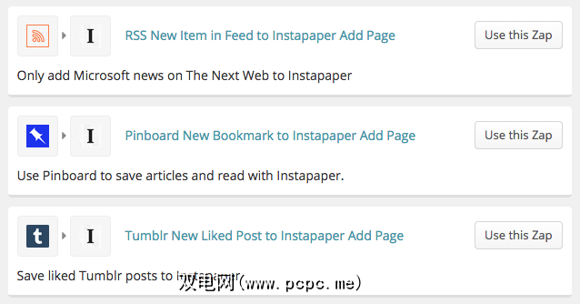 早在2014年5月,Instapaper宣布它与应用程序自动化平台Zapier集成。这意味着您可以更轻松(自动)将大量其他网站和应用程序中的内容保存到Instapaper。上图中的一些示例。为了了解Zapier提供的功能,此短视频是不错的入门指南: