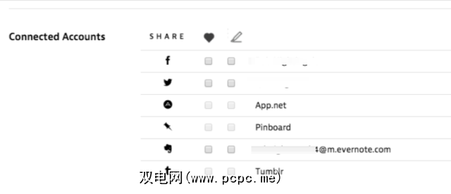 在Instapaper本身中,您可以可以登录到您的Twitter,Facebook,app.net,Pinboard,Tumblr和Evernote帐户,然后选择直接将喜欢的文章和要点发布到这些帐户。