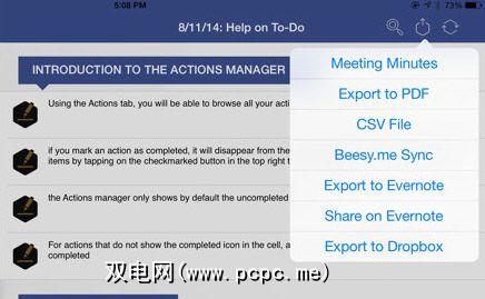 会议笔记和其他内容可以导出到Evernote,Dropbox, .CSV文件和通过电子邮件发送。您帐户中的所有数据都是跨设备同步的(需要每月支付5欧元的费用),但是我在测试过程中有时发现过程有些缓慢。
