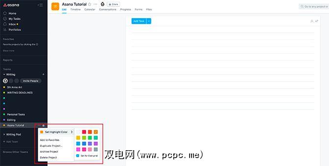 任何任务都可以是重复的。要创建重复任务,请在侧边栏的 Teams 部分下,单击您的项目名称“ Asana Tutorial"。这样可以确保项目处于活动状态。