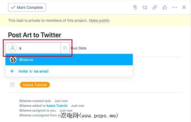 将任务分配给某人,单击“到期日期"旁边的人形图标。输入他们的名字。通过单击他们的用户名,任务将分配给他们。
