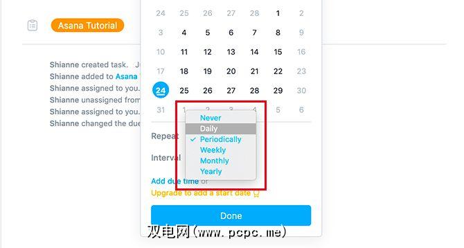 要启用重复,请点击设置为重复。这将弹出一个下拉菜单,您可以在其中选择每日,定期,每周,每月或每年的时间间隔。