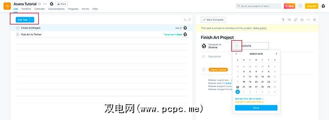 点击添加任务,填写标题,受让人和截止日期,但是当您到达截止日期时,请不要点击设置为重复。