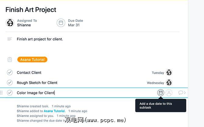 这将自动为您创建一个子任务。像父任务一样,您可以为其命名,给它一个到期日期或将其分配给其他人。