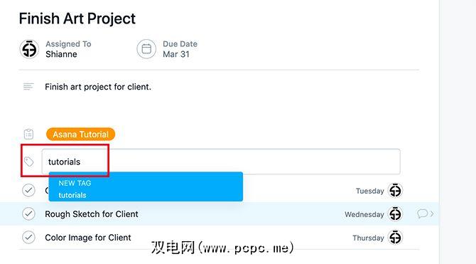 创建子任务后,您可能希望为该项目添加标签,这样更容易供您查找。要对其进行标记,请按 Tab + T 弹出标记框。该框将显示在您的子任务上方。
