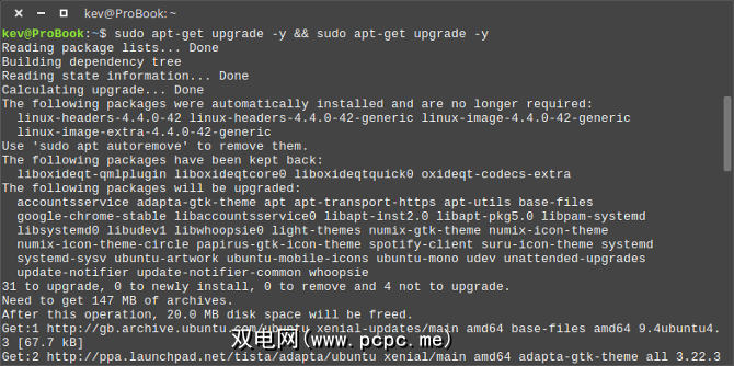 此命令基本上是告诉APT运行更新并对所有提示说是,然后运行升级,然后再次对任何提示说是。这将完全自动化更新和升级过程。