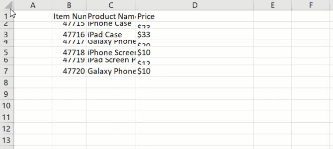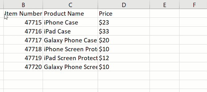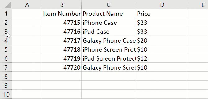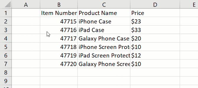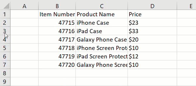 无论您决定使用Excel做什么,列,行和单元格的基本格式都可以帮助您您可以轻松查看数据。例如,您可以使用电子表格的第一行来插入标题。就像在我们的产品表示例中一样,您可以使用商品编号,产品名称和价格。