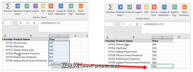 AutoSum中的其他选项的工作原理类似。也许您需要获取一组单元的平均值。首先,单击要显示平均值的单元格。接下来,点击 AutoSum 按钮的箭头。同样,Excel将自动检测数字,突出显示单元格并提供公式。单击 Enter 键以插入平均值。