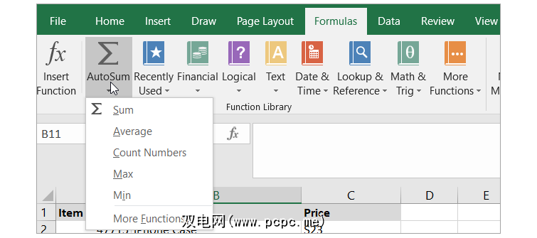 如果只单击 AutoSum 按钮,它将自动插入求和函数。但是,如果单击按钮上的箭头,则会看到上面可以使用的其他常用公式。
