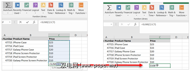 注意:等号表示公式。 SUM 是功能。并且 C2:C7 是适用的单元格。