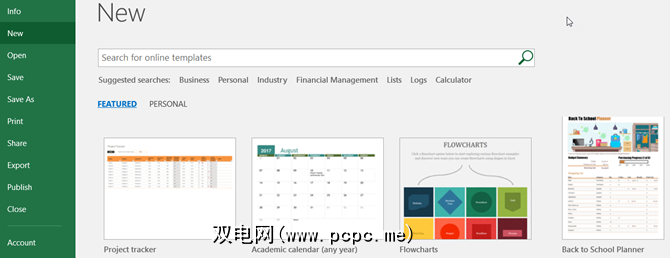 要在Excel中查看选项,请单击文件>新建。然后,您将看到许多可以使用的特色模板,可以从中选择的类别以及如果需要特定内容的搜索框。