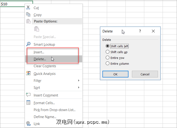 您可以以与列或行相同的方式插入或删除单元格。但是,无论使用哪种方法,您都会收到一个弹出警报,询问您如何移动单元格,行或列。只需选择一个选项,然后单击确定。