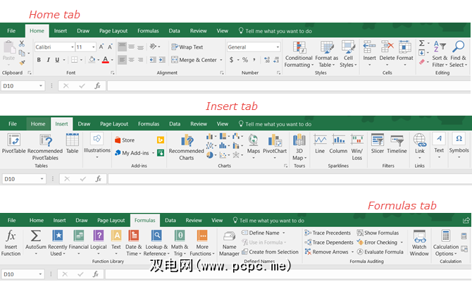 您应该花一点时间来熟悉Excel中的功能区。与其他Microsoft Office应用程序一样,功能区中包含将在选项卡中使用的按钮。您可以自定义功能区以删除或添加选项卡和按钮。但是默认情况下,您可能会在下面看到这些标签。