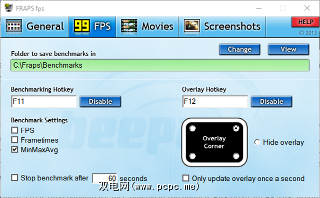 要执行实时基准测试,请下载流行的FPS程序装饰。当Fraps运行时,您的FPS读数将自动出现在屏幕的一角。打开Fraps并打开FPS选项卡以调整指示器的方向。