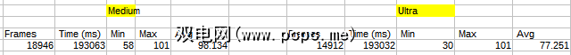 游戏处于打开状态时,请按键盘上的 F11 开始进行基准测试。帧数将开始计算您的最小,最大和平均FPS等级。这些规范作为.csv(电子表格)文件保存到您的 C:\ Fraps \ Benchmarks 文件夹。下图是Fraps读数的示例。左基准是在“中"设置中运行“中土:魔多之影" 而获得的,右基准是在“超"设置中显示了类似的游戏玩法。