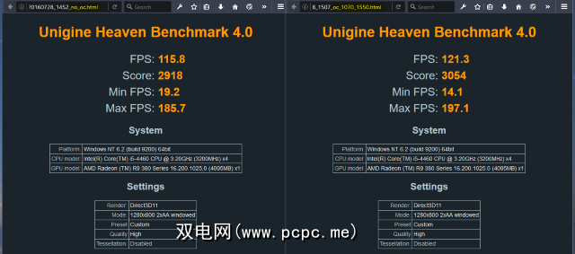 我将核心时钟从980 MHz增加到了1070 MHz,并将内存时钟从1070 MHz增加到了1550 MHz,对我的GPU超频后,FPS和Heaven Benchmark得分增加。测试完成后,您还可以保存结果。 Heaven Benchmark默认情况下将保存在您的 C:\ Users \ [PC名称] 文件夹中。