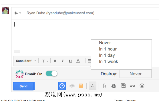 另一个与Gmail集成的选项是Dmail,它赢得了一些好评。我尝试过,发现它非常令人印象深刻。 Dmail具有切换开/关开关,您可以指定何时销毁邮件。但是,您只有三个选项,无法自定义时间段。因此,在这方面,它有点受限制。