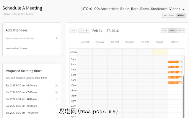 在PCPC.me上使用的非电子邮件等效项就是出色的ScheduleOnce。它会插入您的Google日历,一旦所有人都输入了所有可用的时间,该网站就会将所有内容组合在一起以找到适合所有人的时间段。