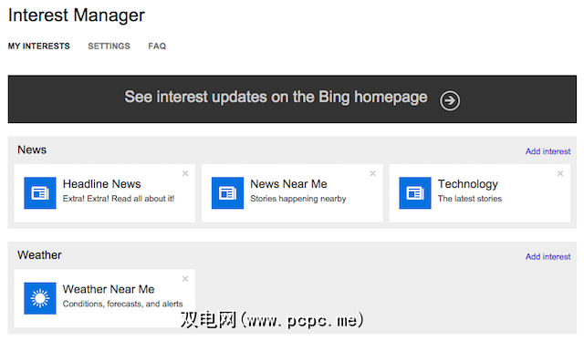 Bing还向用户显示了Facebook和Twitter上的热门新闻,并且像Google一样提供个性化选项您的新闻提要一定程度上。要在Bing上执行此操作,请点击设置按钮,然后点击兴趣管理器。这些主题将显示在页面顶部的菜单中。