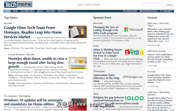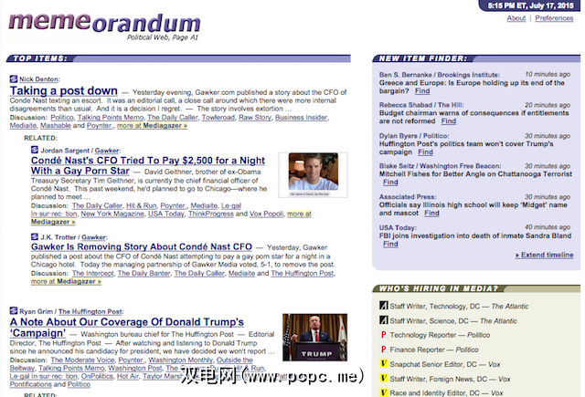 如果不是科技新闻,那么Techmeme实际上有一个名为 Memeorandum 的姐妹网站。您可以在这里找到有关政治和时事的所有最新信息。该网站的运作方式与Techmeme相同,并且还提供了一个“河流",但公认导航难度较大。