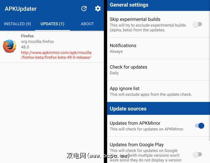 APKUpdater通过扫描已安装应用程序列表并向您显示哪些应用程序有可用更新,使此过程变得容易一些。它还包括指向APK Mirror的直接链接。不过,APKUpdater不会自动更新应用程序-您仍然需要下载并安装它们。