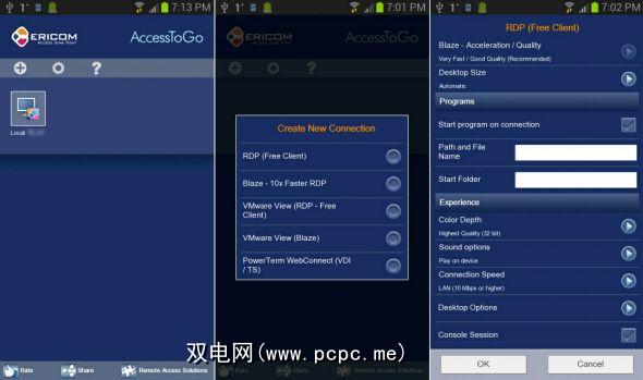 AccessToGo具有经过测试的RDP应用程序的大多数功能。您不仅可以创建标准RDP连接,还可以创建与VMWare View的连接,这对于您的系统管理员运行虚拟服务器来说非常有用。 Ericom还提供了Blaze RDP服务器,您可以将其安装在桌面上,以实现更快的RDP连接。您必须为Blaze RDP服务器请求报价,因此它可能更多地用于商业环境。如果您在工作中使用VMWare,则还可以在免费应用程序上创建VMWare View连接。对于服务器管理员类型来说非常方便。