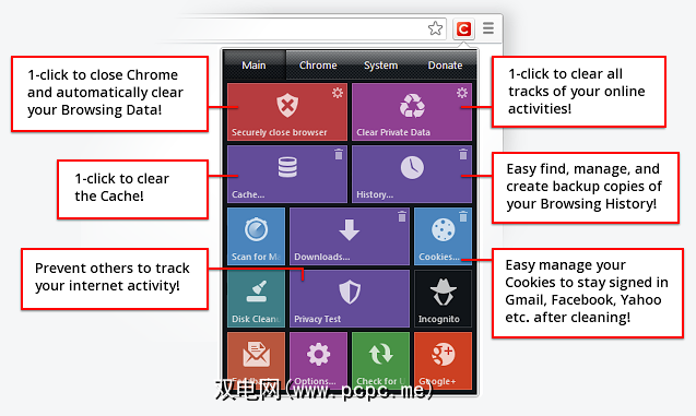 Click&Clean允许您通过单个按钮删除URL,清除缓存,删除Cookie以及擦除下载和/或浏览历史记录。