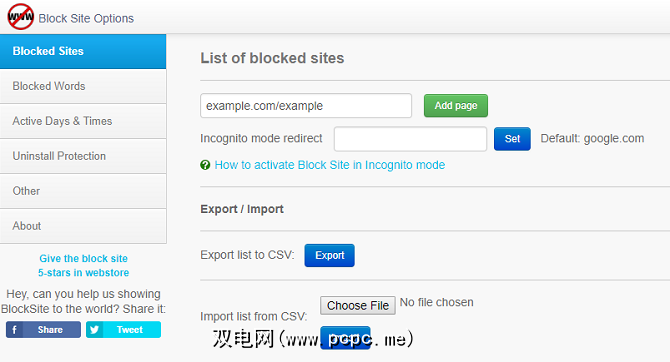 “阻止网站"可让您设置星期几和几天的过滤器。它提供了一个预先填充的常见站点列表,但是您也可以添加自己的站点。