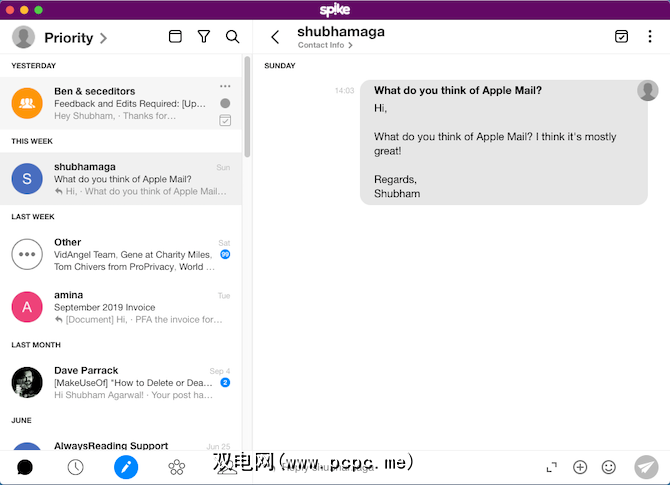 在左侧,您有一条消息列表。当您单击一个时,Spike会在右侧启动一个聊天窗口,显示其内容以及您过去与发件人交换的所有其他电子邮件。底部有一个回复框,带有附件和表情符号按钮,类似于消息传递应用程序。