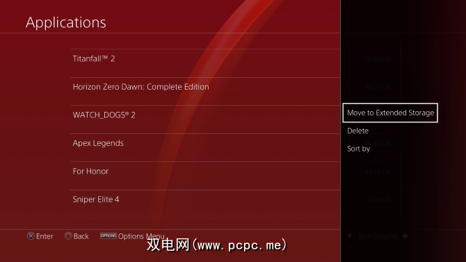 现在按控制器上的 Options ,然后选择 Move to Extended Storage (移至扩展存储)(或< strong>移至系统存储)。检查所有要移动的游戏,然后按移动并确认。