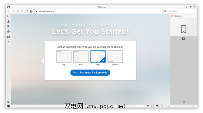 Vivaldi与其他浏览器之间的区别显而易见从一开始就。首次启动时,Vivaldi会提示您选择选项卡栏的主题和位置。如果将标签放在左侧或右侧,则会为每个站点显示缩略图。