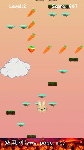 跳得更高一些,以避免您下面的熔岩越来越热。一路上收集强力食品。甜甜的胡萝卜和草莓会给你增加动力。倾斜手机以使Bouncy Bunny水平移动。