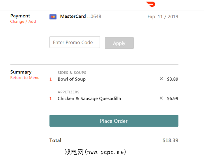 接下来,您只需填写信用卡信息(或选择信用卡信息,如果您已经(先从Doordash订购),然后单击下订单。
