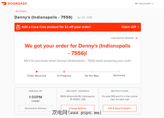 与UberEats不同,Doordash不会为您提供包含订单GPS位置的地图。取而代之的是,您会看到一个实时进度条,该进度条会在您的订单被煮熟,由送货员提货并最终送货给您时更新。