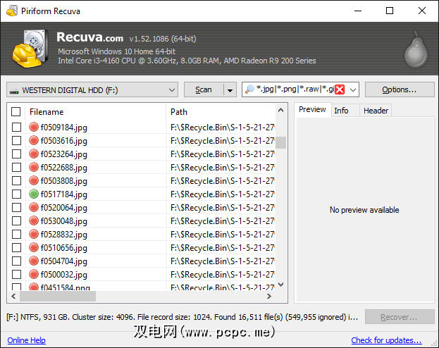 如果可能的话,Recuva将为您显示该文件的预览恢复。这适用于大多数图像文件,但不适用于PDF等文件。尽管如此,您还可以使用每个文件旁边的交通指示灯来查看成功恢复的可能性。