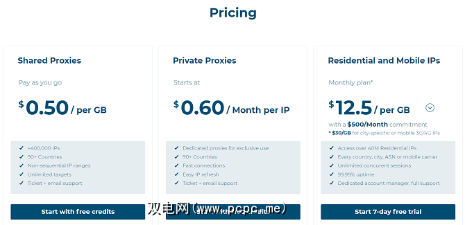 Luminati提供了三种不同的付费套餐。共享代理的价格为每GB 0.50美元,私有代理的价格为每个IP每月0.60美元,住宅和移动IP的价格为每GB 12.50美元。