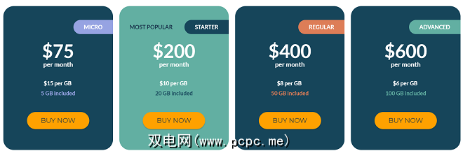 入门级计划的费用为75美元每月5GB的带宽。计划的价格也分别为200美元,400美元和600美元,每个条件都有改进。