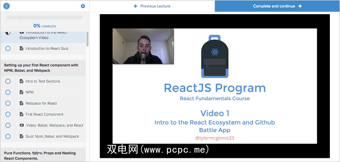 Tyler McGinnis是著名的React开发人员和讲师,多年来一直从事关于React的教学和写作。他目前有关于React培训[不再可用]的四门课程,其中第一门是完全免费的,可以作为其他课程的切入点。